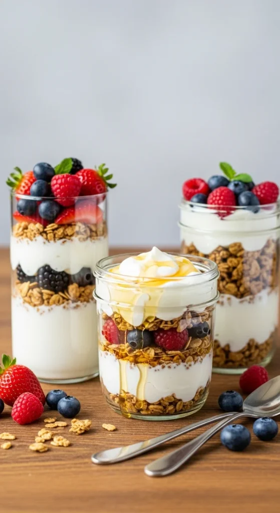 Healthy and colorful. Layer yogurt, granola, and fresh fruit in jars or glasses. You can prepare them the night before for quick serving. Add a drizzle of honey for sweetness.