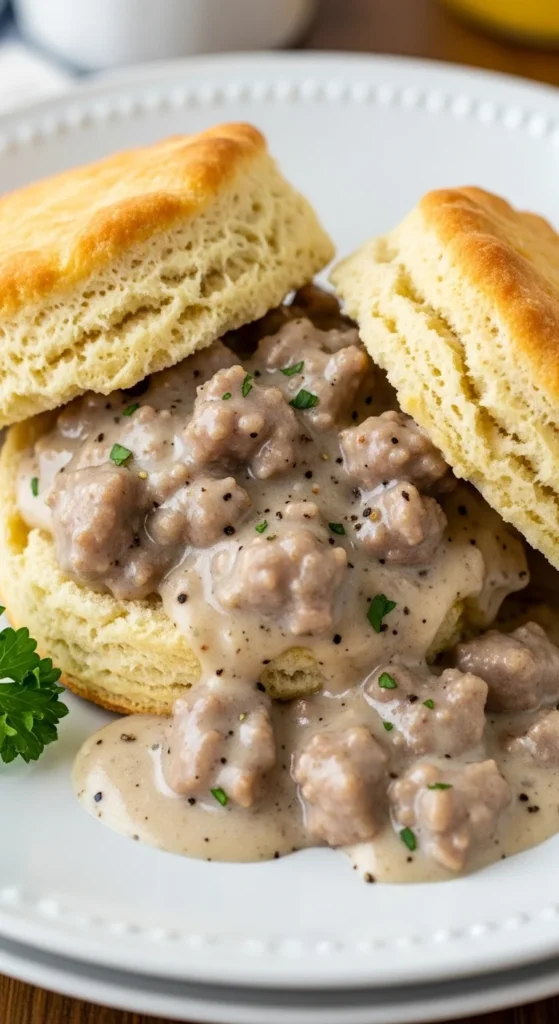 A southern-style comfort breakfast. Cook sausage in a skillet, add flour and milk for thick gravy. Pour over warm biscuits. It’s hearty, flavorful, and perfect for lazy Christmas mornings.