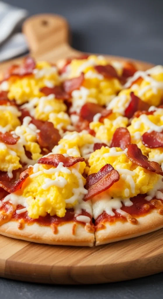 Use pre-made dough or pita as a base, top with eggs, cheese, and bacon. Bake until bubbly. It’s fun for kids and lets everyone grab a slice quickly.