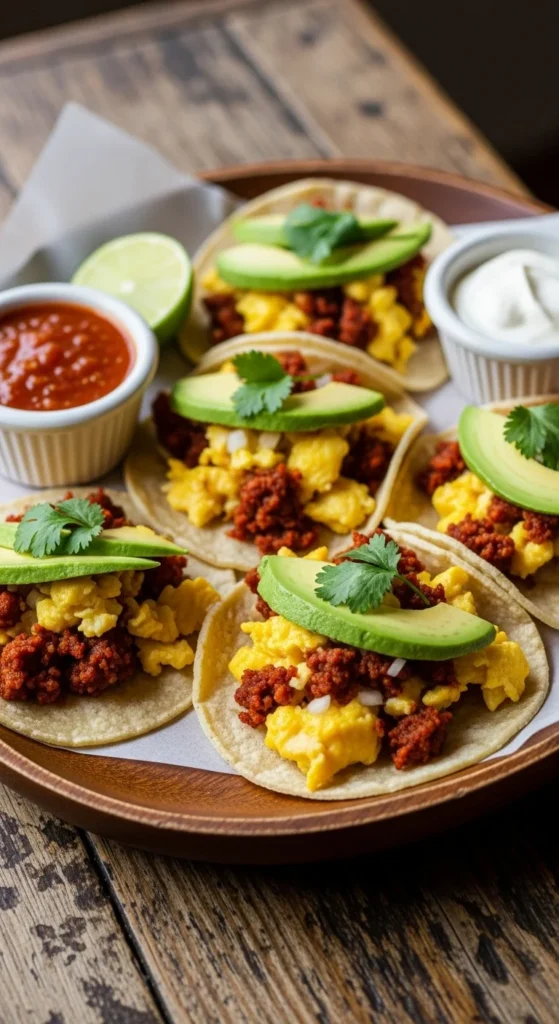 Spicy and satisfying. Cook chorizo, scramble with eggs, and spoon into tortillas. Add avocado or salsa for freshness. It’s a bold way to start the day.