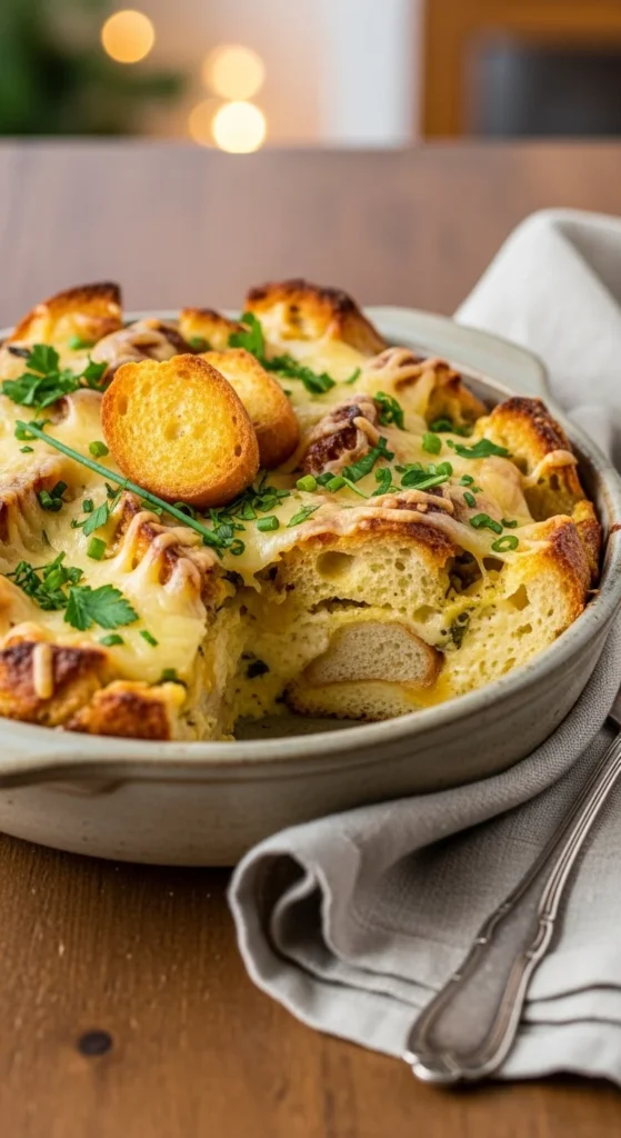 Use stale bread, eggs, cheese, and vegetables for a hearty baked breakfast. It’s rich, comforting, and helps reduce food waste—perfect for the holidays.