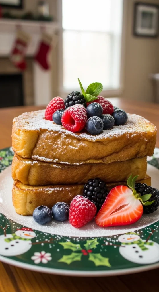 Soak bread in a mixture of eggnog, eggs, and vanilla. Cook until golden on both sides. The subtle nutmeg flavor makes it special. Top with syrup or a dusting of sugar for a festive finish.