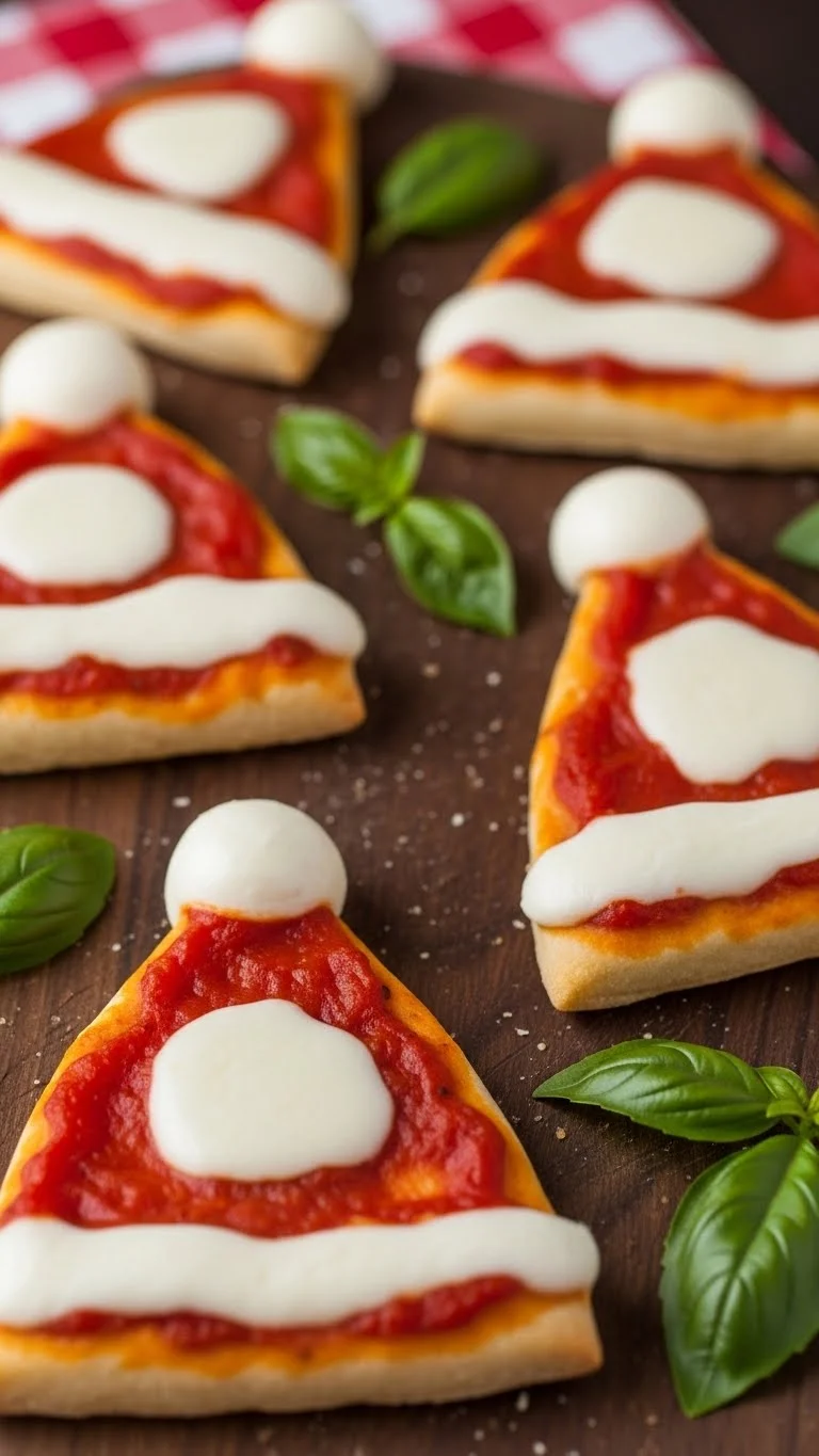 Shape dough into triangles, spread sauce, and add a mozzarella “trim.” A small mozzarella ball makes the pom-pom.