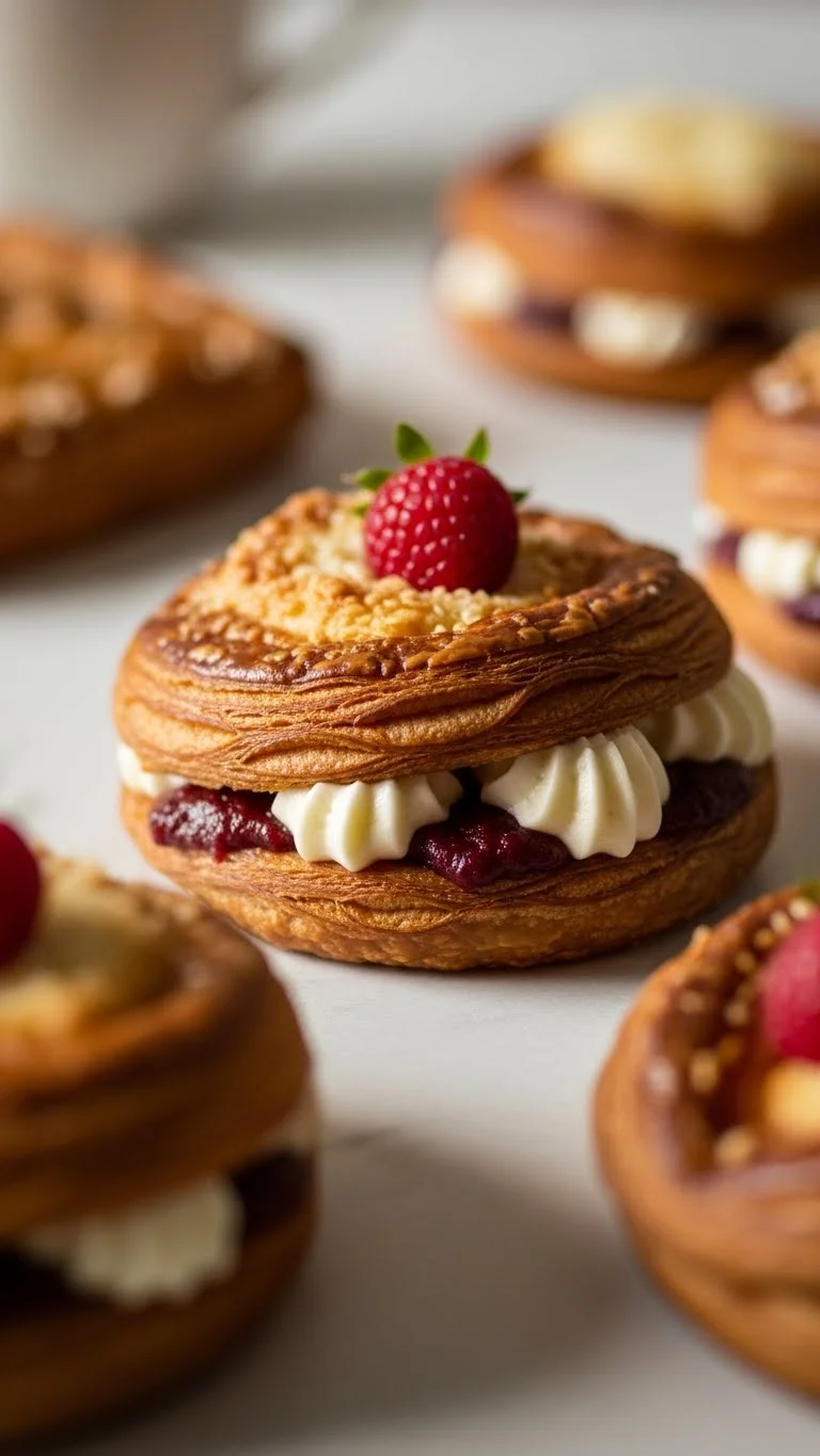 Cut puff pastry circles, add sauce and toppings, and bake until golden. Add a small olive “hook.”