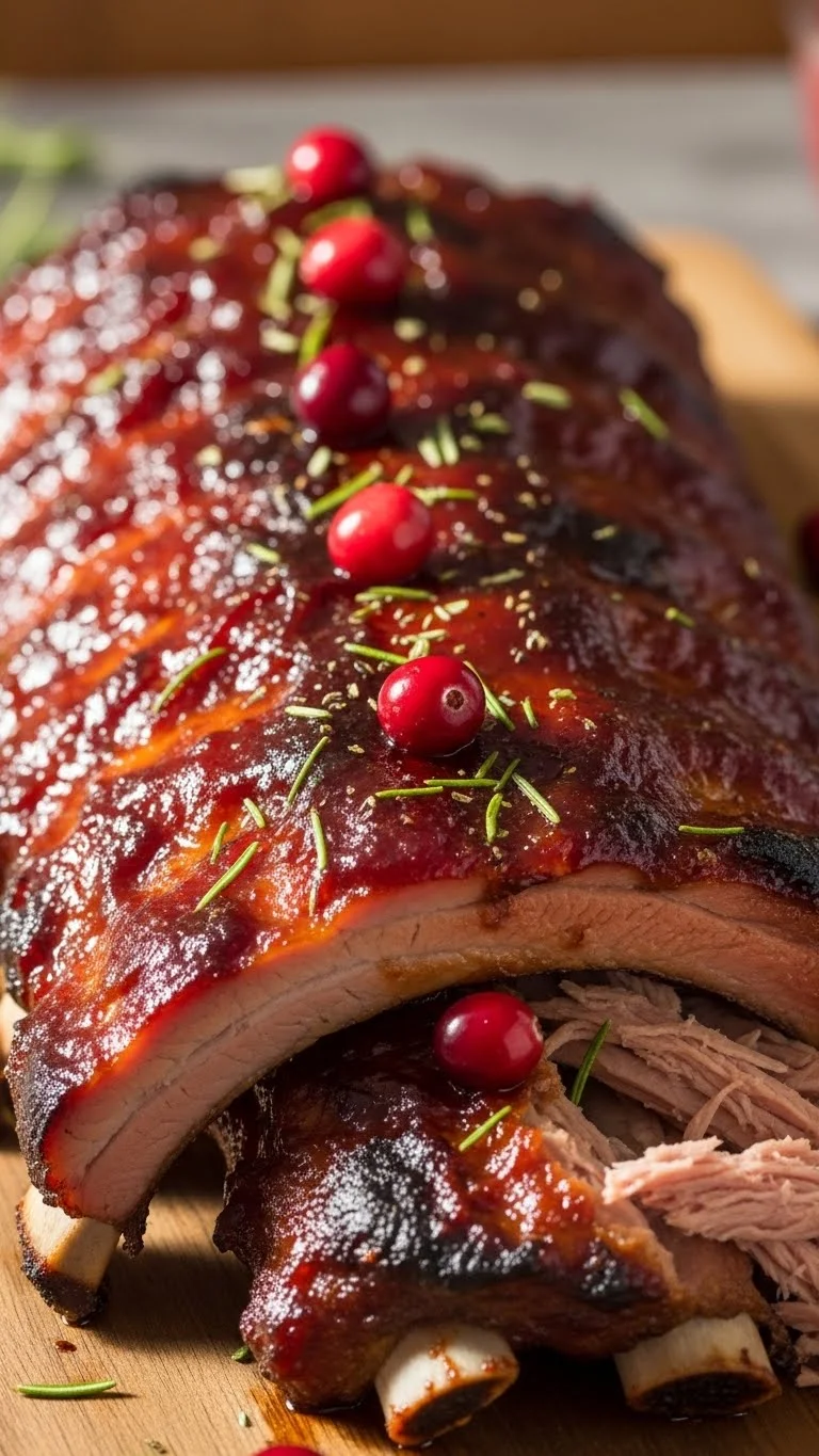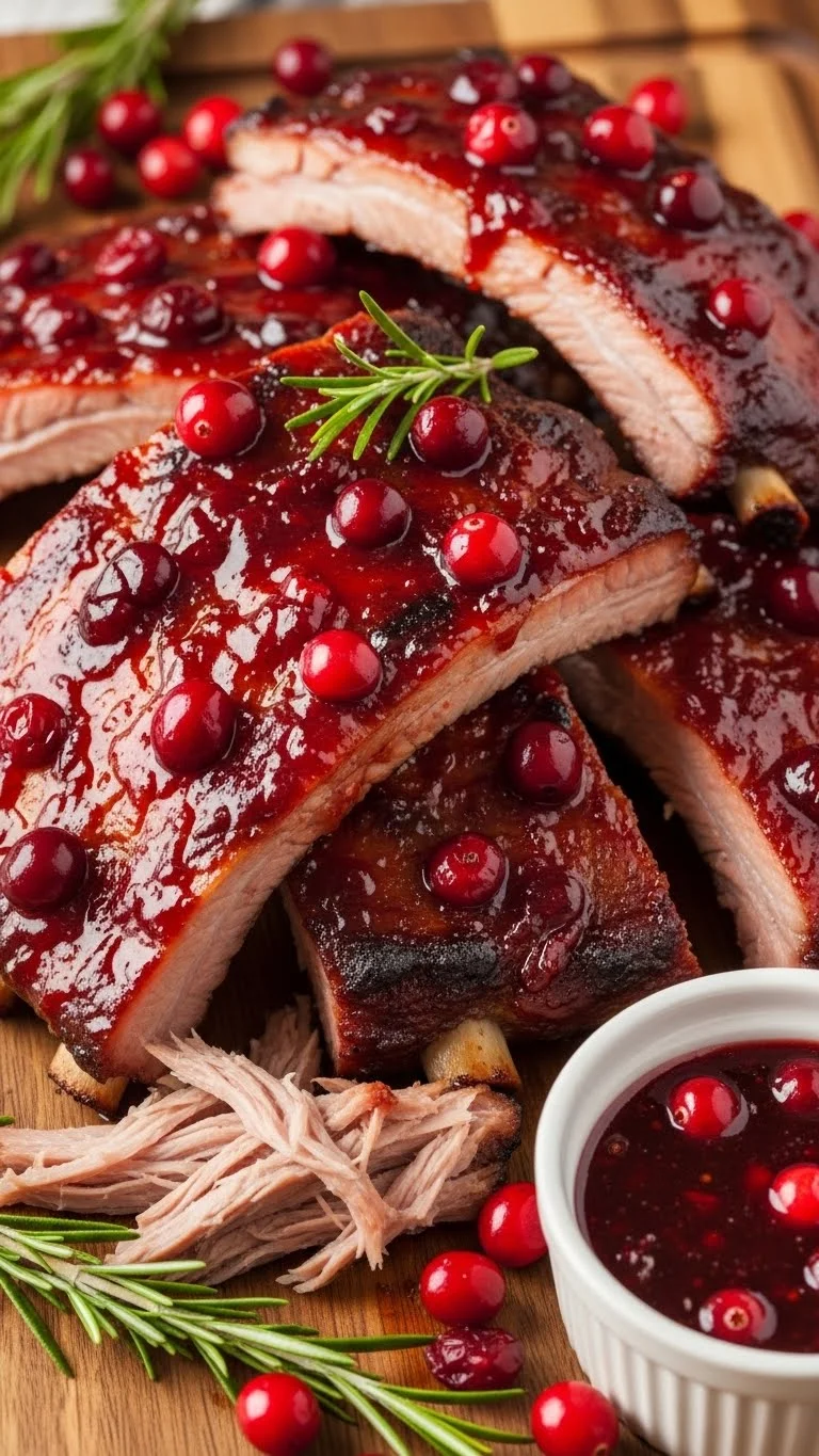 Simmer cranberry sauce with a little vinegar and honey, then brush on the ribs during the last bake. Sweet, tangy, and festive.