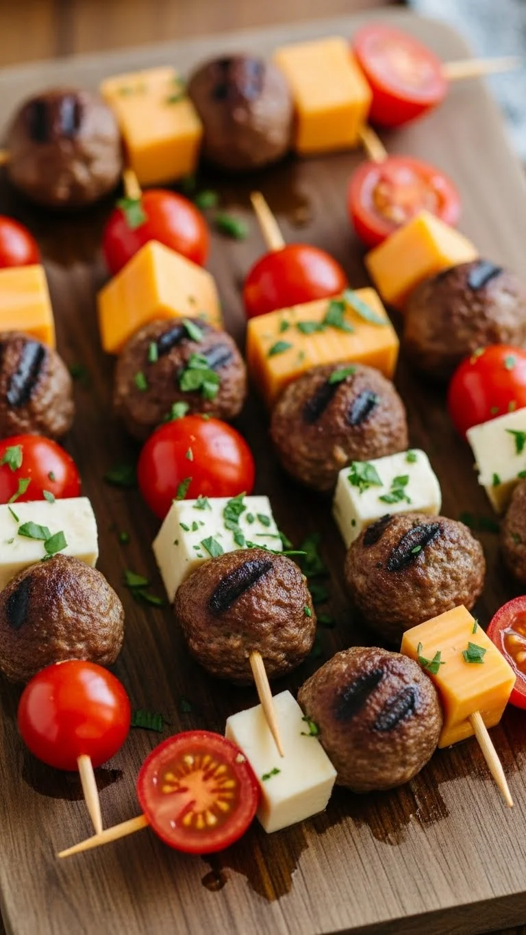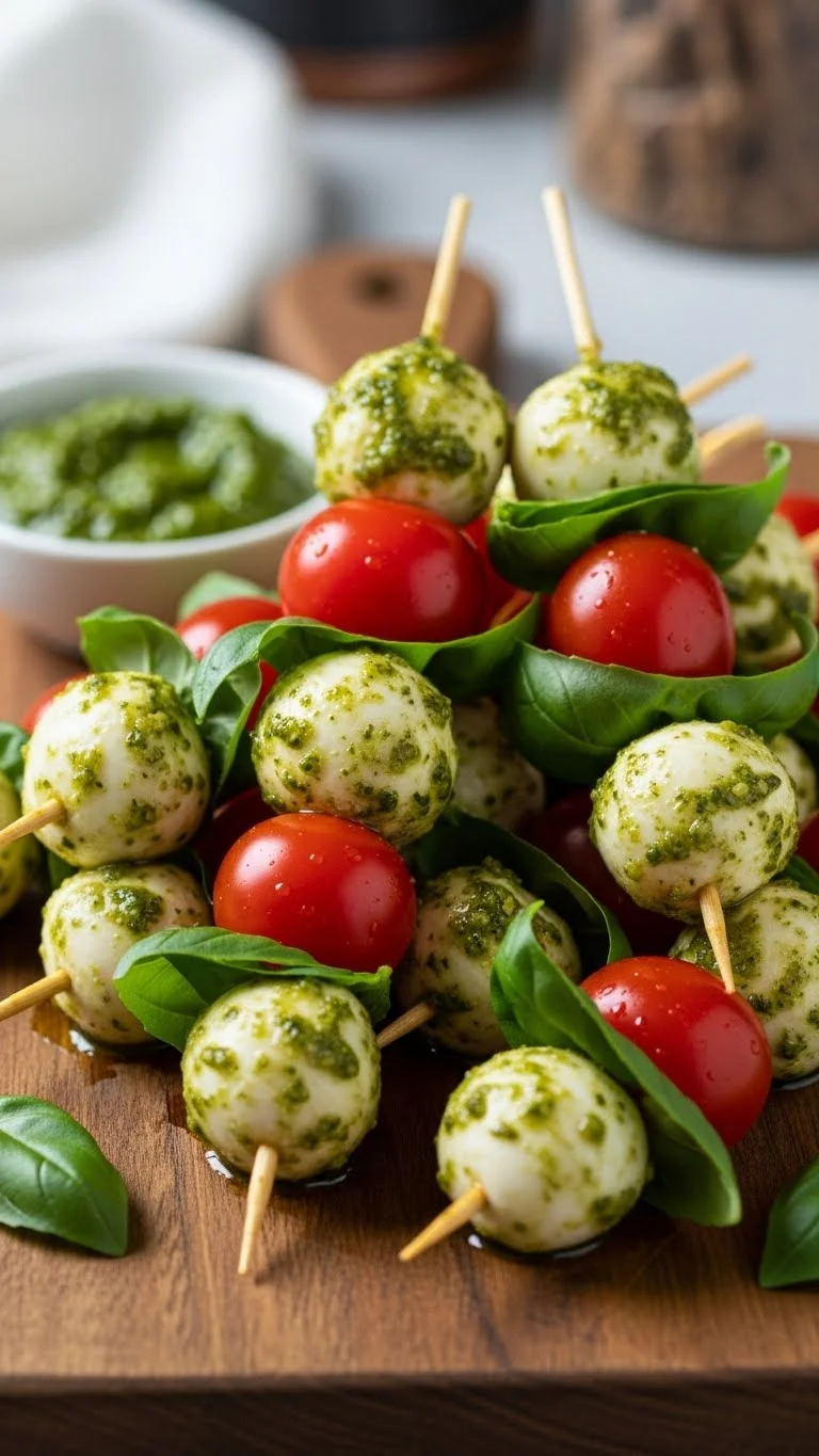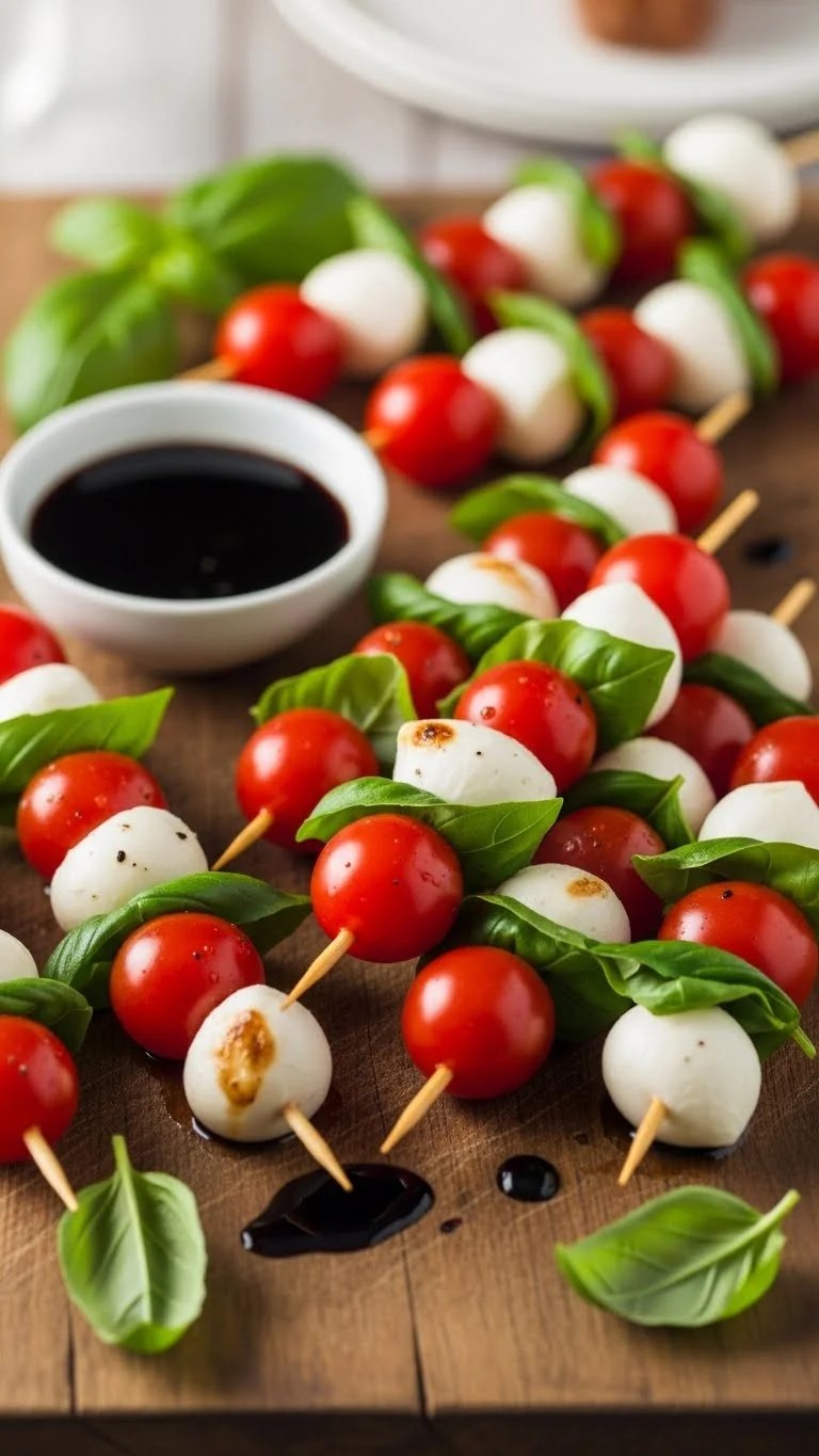 Thread tomatoes, mozzarella, and basil. Drizzle lightly with olive oil. Fresh, simple, and full of color.