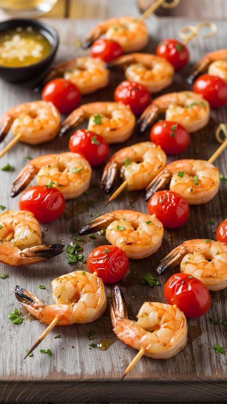 Skewer cooked shrimp with tomatoes and a squeeze of lemon.