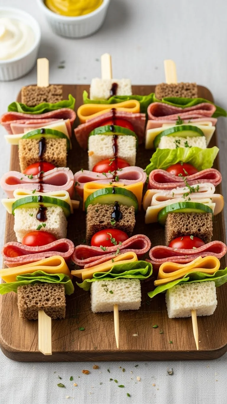 Thread bread cubes, turkey, cheese, and lettuce for a cute mini stack.