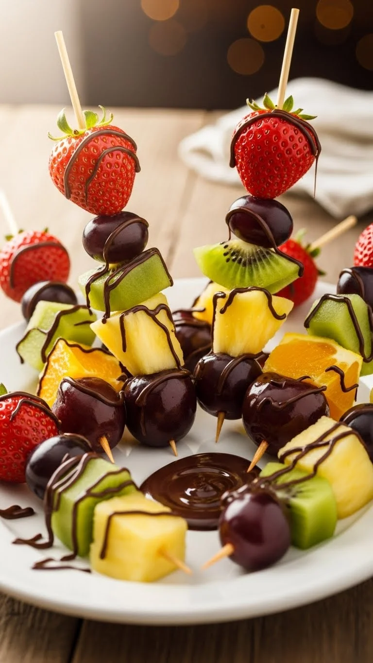 Thread fruit and drizzle lightly with melted chocolate for a fast dessert.