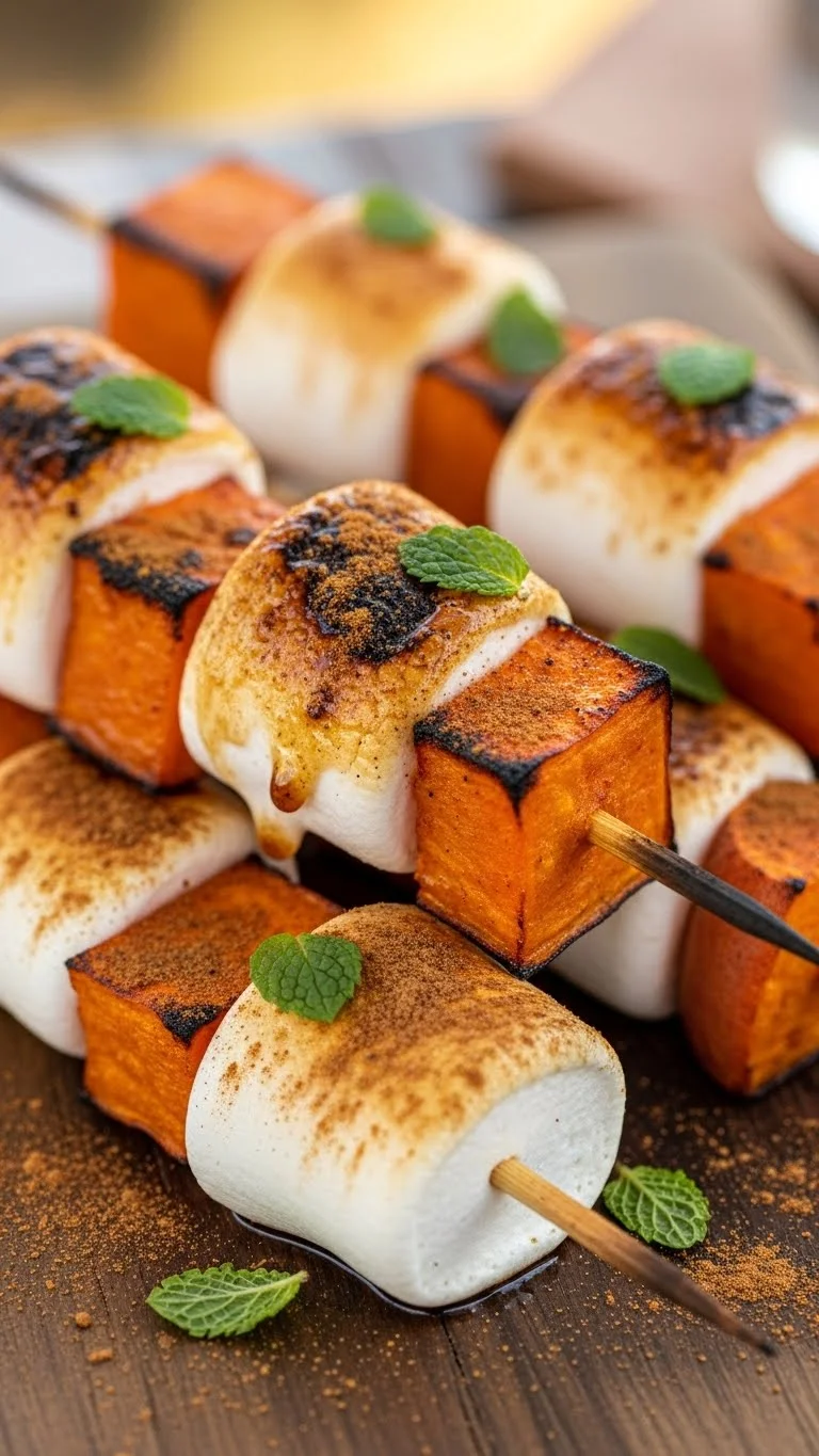 Roast sweet potato, skewer with marshmallow, and warm lightly.
