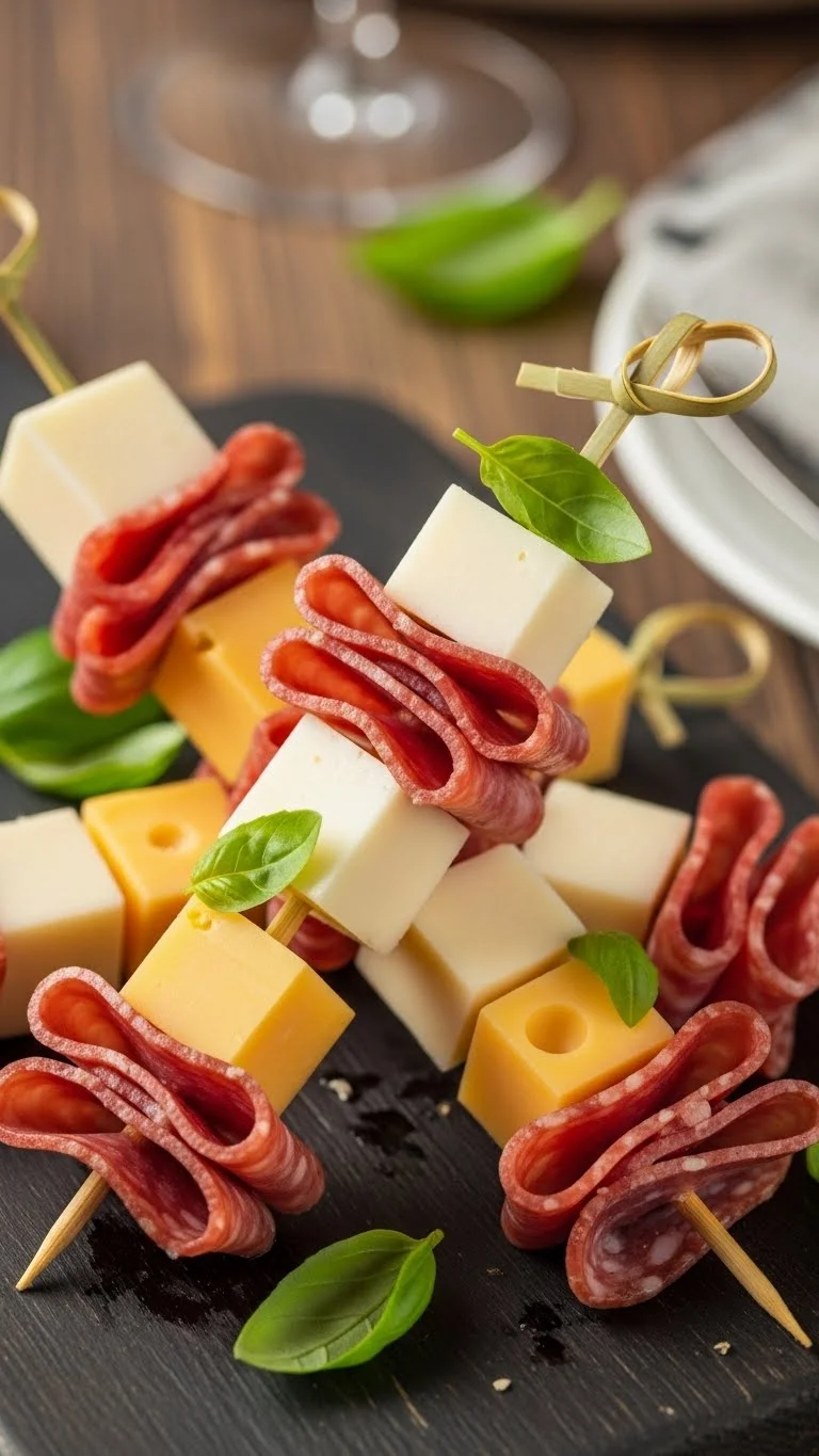 Thread cheese cubes and folded salami pieces for a hearty snack.
