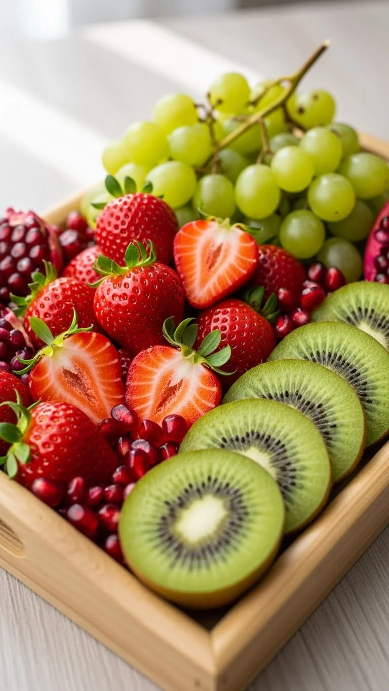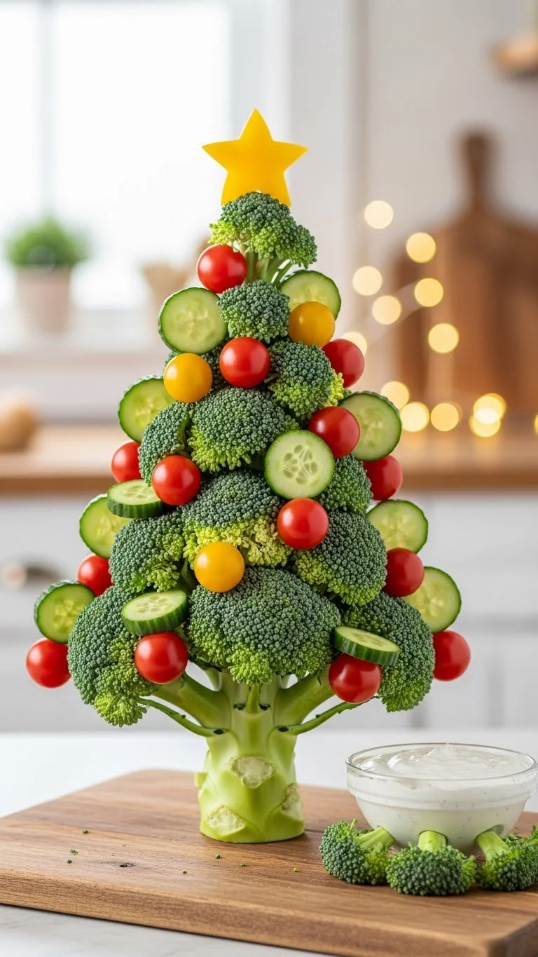Form a tree outline with broccoli florets, then fill the center. Add cherry tomatoes as “ornaments” and sliced cucumbers as trimming. A small star-shaped pepper slice at the top makes it extra fun.