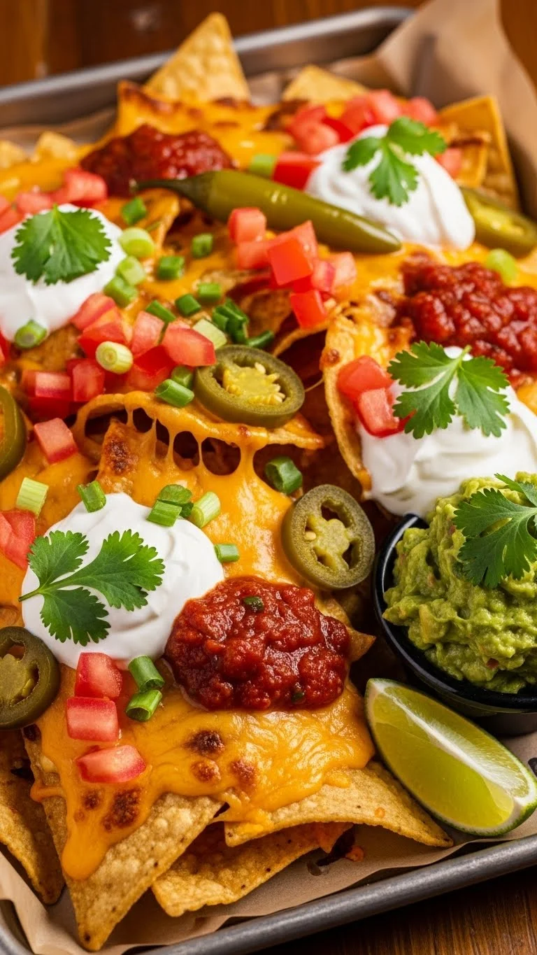 Spread chips and sprinkle toppings. Bake on the tray and serve directly for easy cleanup.