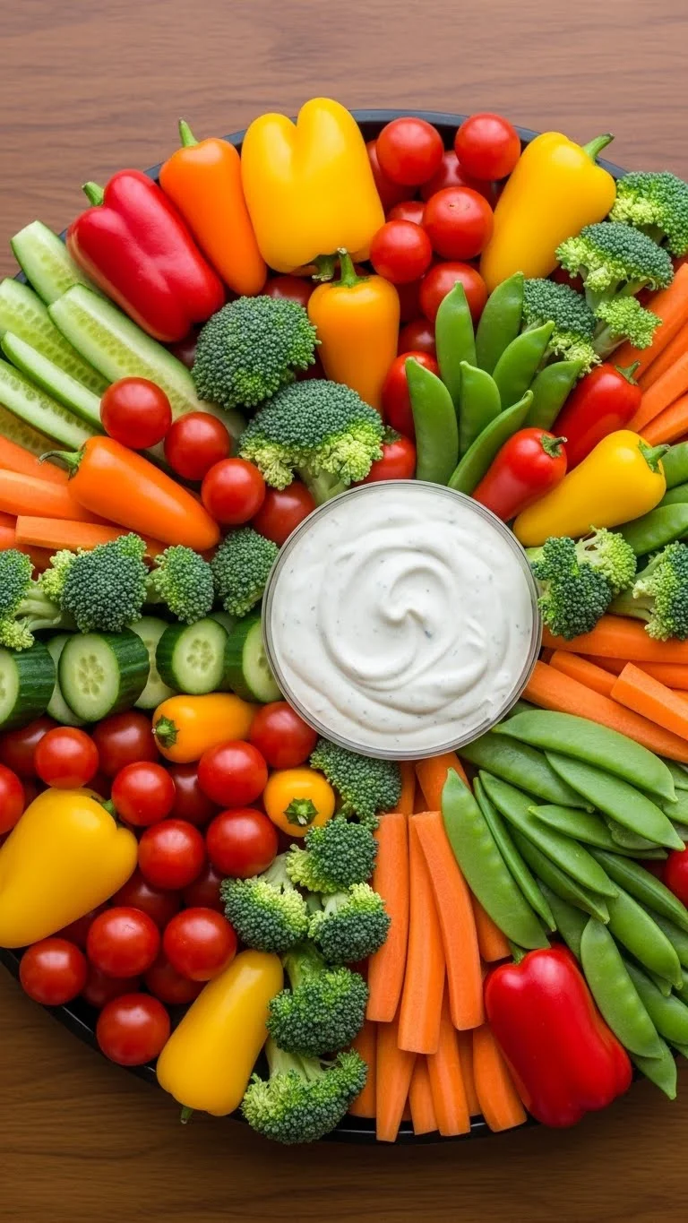 Use cucumbers or broccoli in a circle, add cherry tomatoes as “berries,” and place dip in the center.