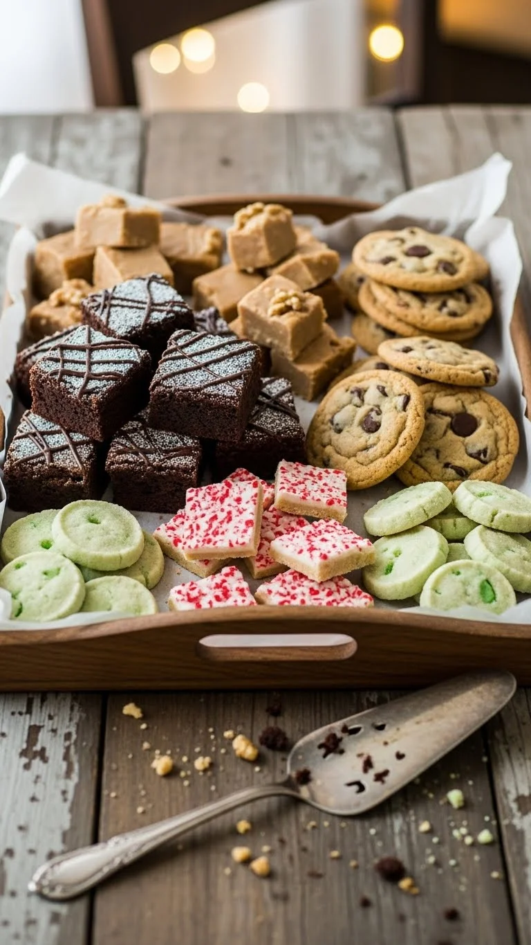 Slice brownies, fudge squares, and cookies, then arrange with a few candy cane sprinkles.