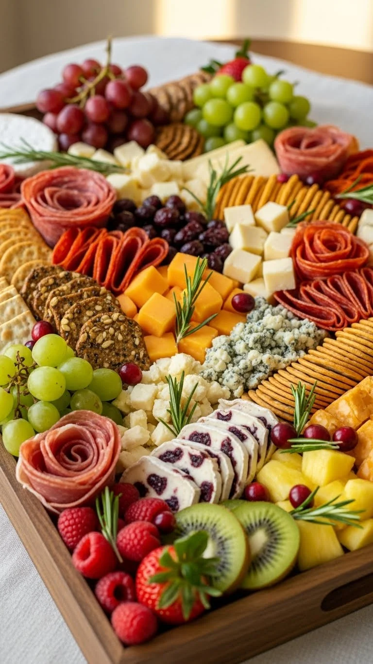 Fill the tray with cheese cubes, seedless grapes, and assorted crackers. Add a few rosemary sprigs for aroma.