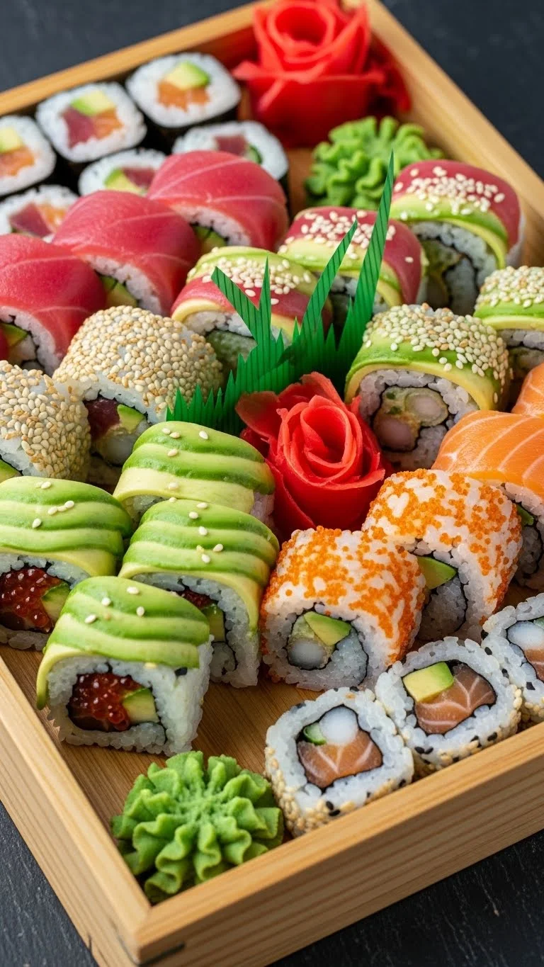 Arrange simple rolls with cucumber, avocado, or crab. Add ginger and wasabi for color contrast.