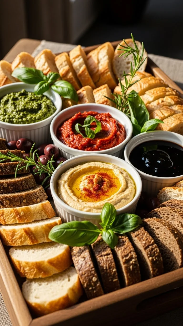 Fill ramekins with dips like hummus, spinach dip, or cheese spread. Surround with sliced bread.
