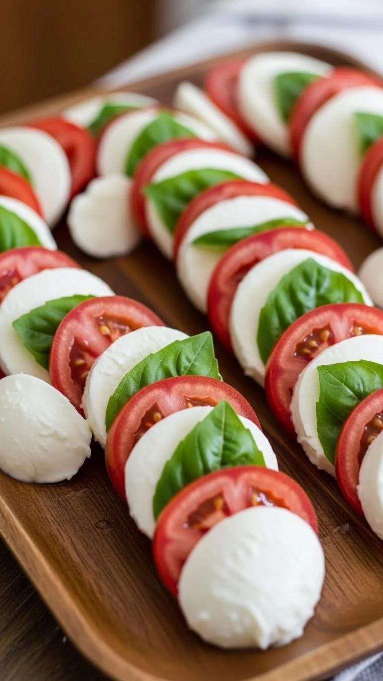 Alternate tomato and mozzarella slices in a candy cane curve. Drizzle lightly with oil and a bit of basil.