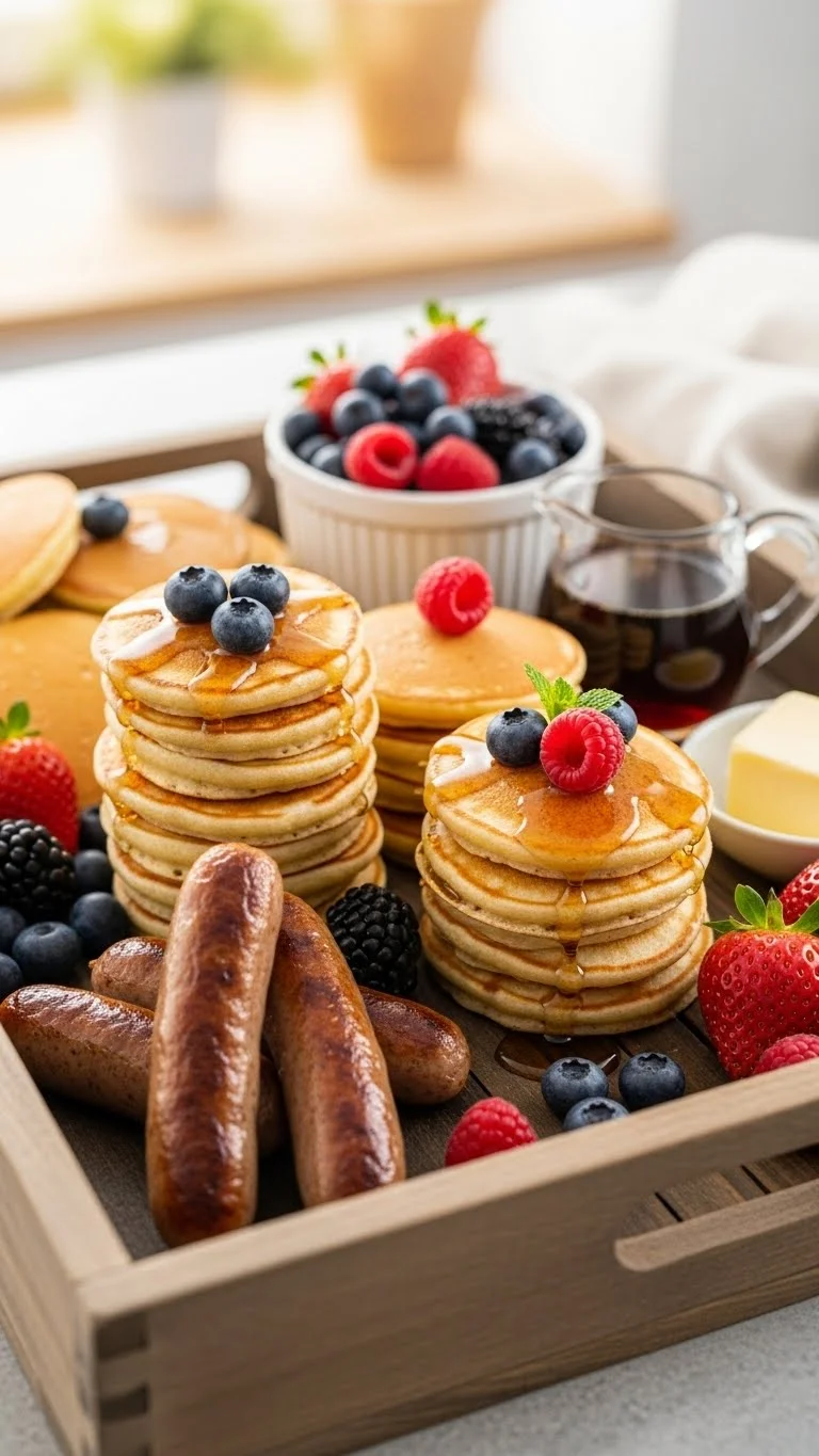 Add small pancakes, strawberries, blueberries, and sausage links. Perfect for morning gatherings.