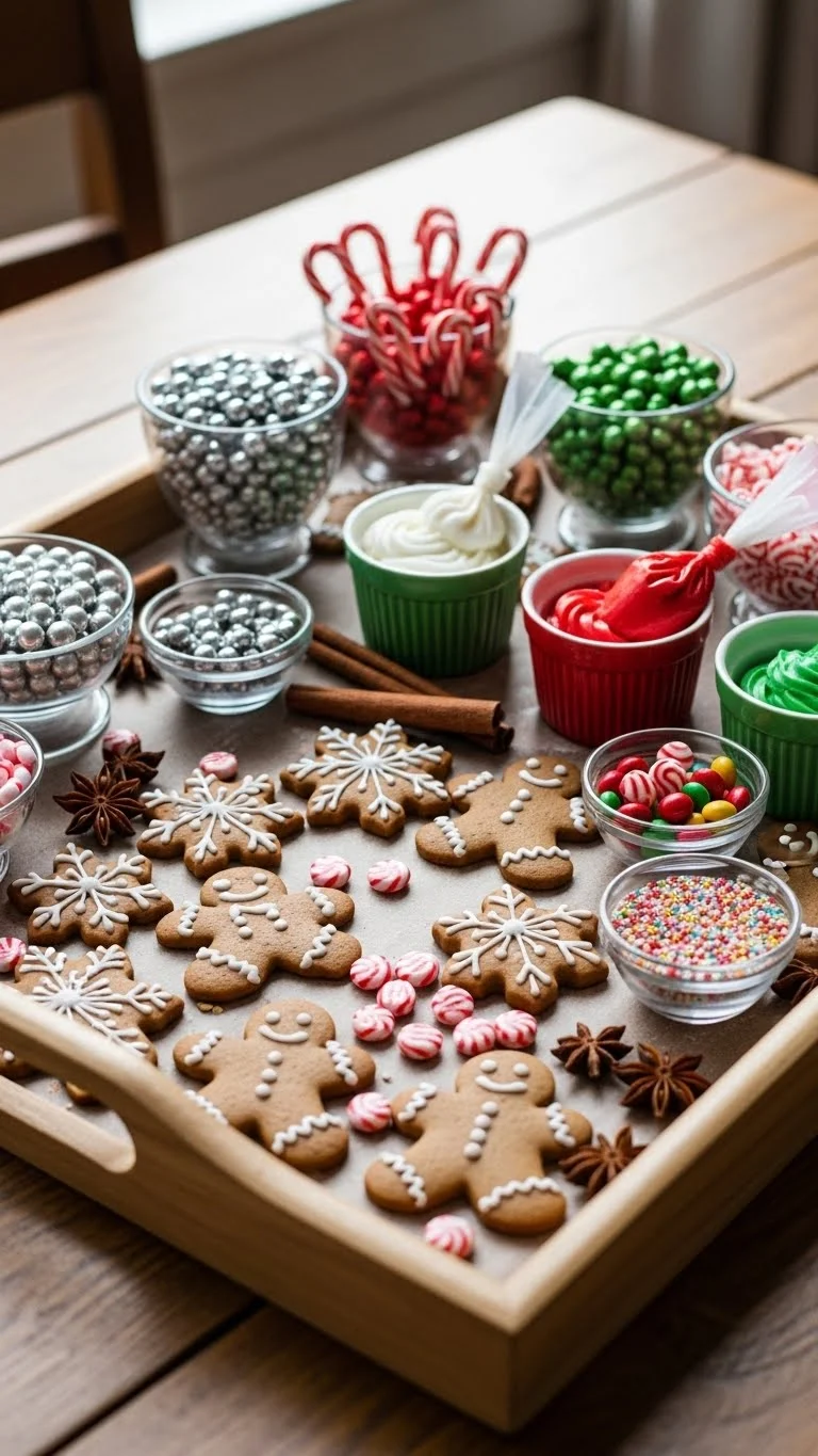 Pile gingerbread cookies with little cups of icing and sprinkles. Kids can decorate while they snack.