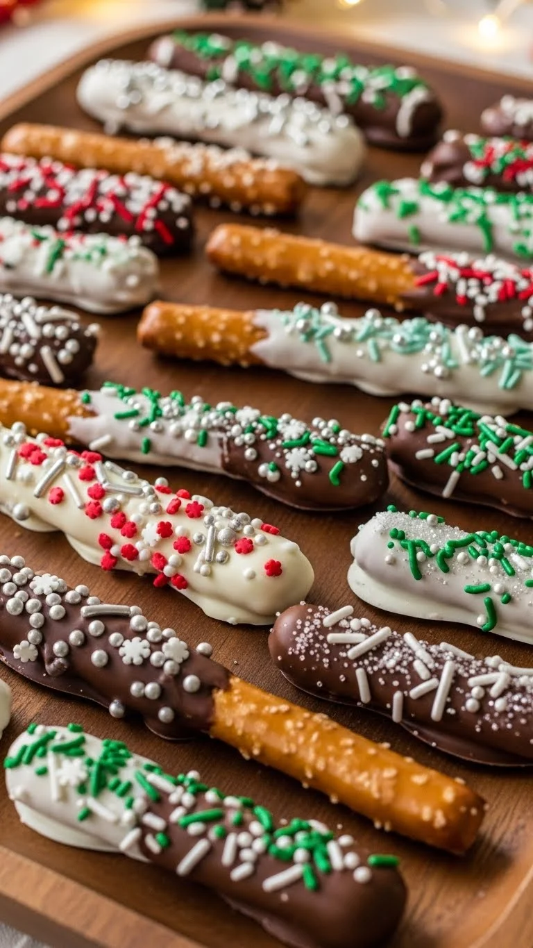 Dip pretzels in melted chocolate and add sprinkles. Fill the tray with a mix of plain and flavored pretzels.