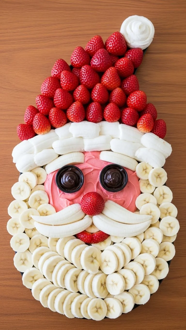Use strawberries for the hat, bananas for the beard, and a small cup of fruit dip as the face center.