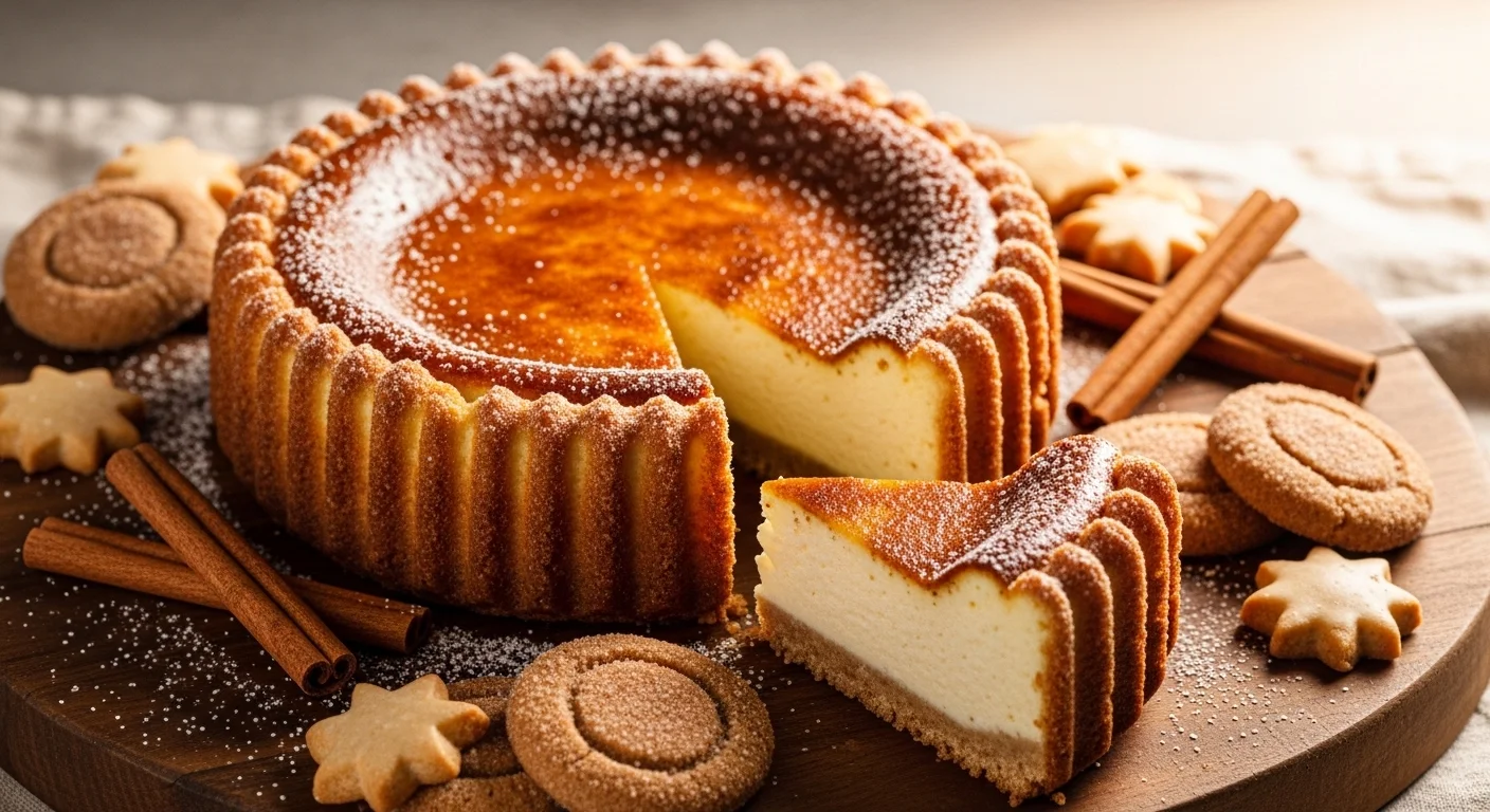 A beautifully baked churro cheesecake recipe with a golden crust, dusted with powdered sugar, surrounded by crispy churros and cinnamon sticks on a rustic wooden table.