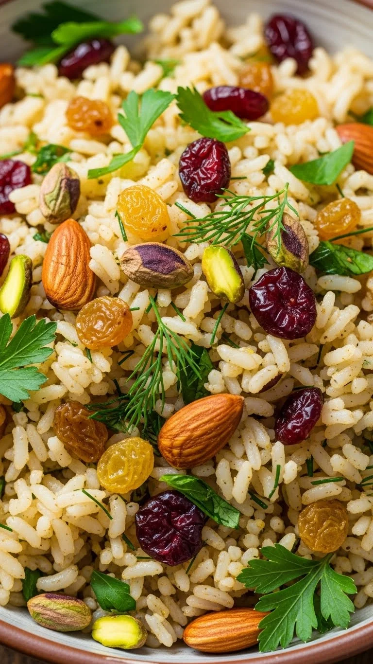 Combine dried fruit, nuts, and herbs with warm rice for a dish that looks ready for celebration.