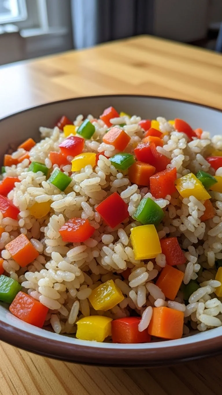 Dice red pepper, green pepper, and carrot into tiny pieces. Fold into rice for cheerful color.