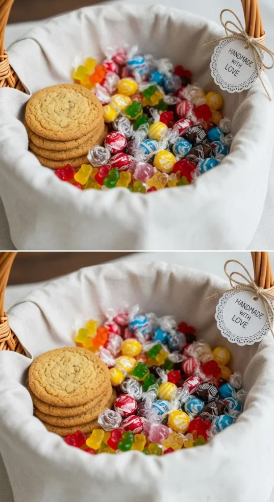 This is where the magic happens — the treats! A balanced mix of sweet, savory, and sippable items creates the perfect basket.