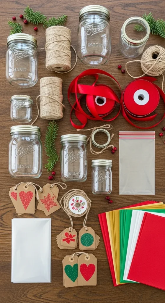- Mason jars: Great for cocoa mix, nuts, or cookies. Add a fabric lid cover and a bow.