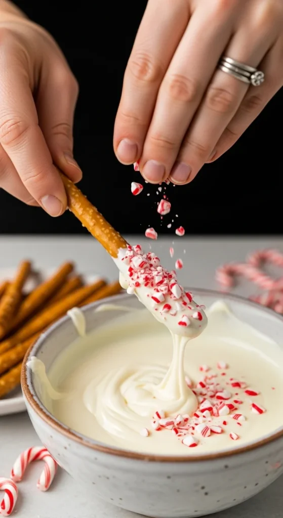 - Dip pretzels or cookies halfway in melted chocolate and top with crushed peppermint.