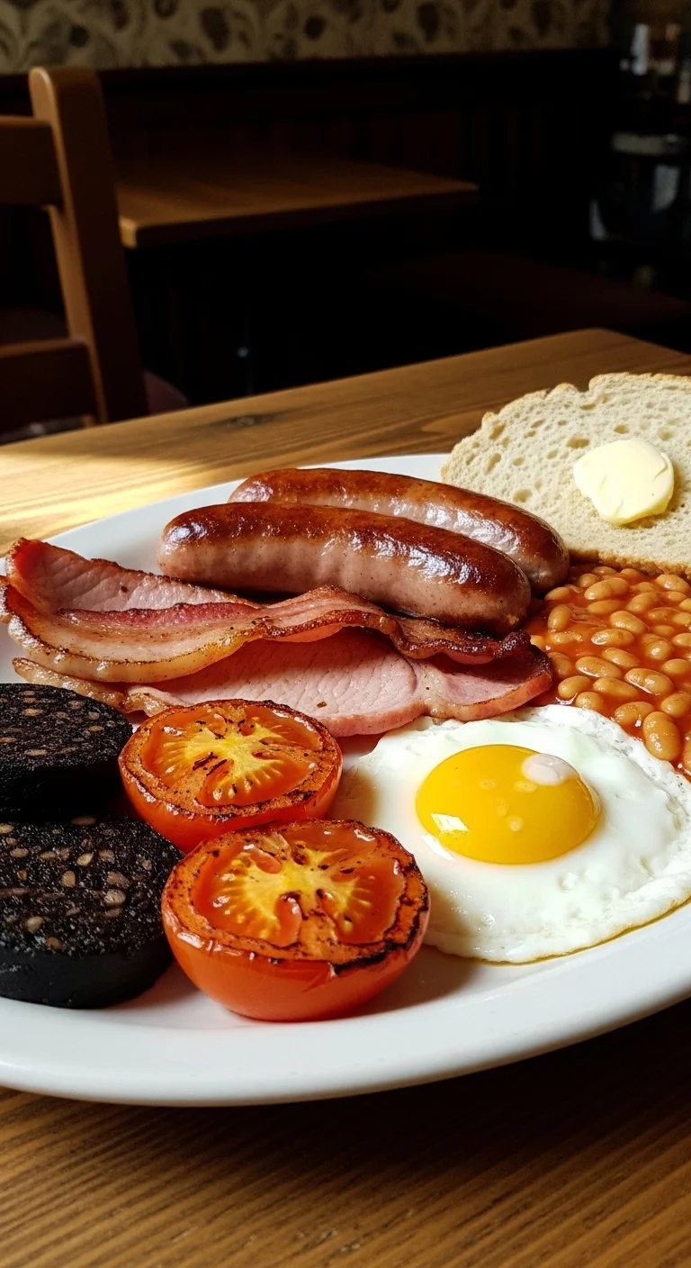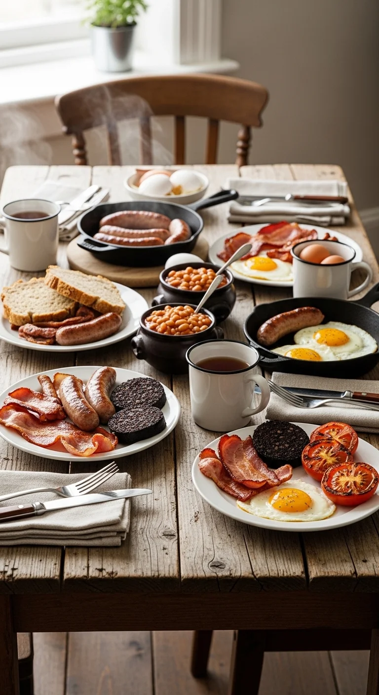 The classic plate includes sausages, back bacon (rashers), black pudding, eggs, baked beans, grilled tomatoes, and fried bread or toast. Cook each component separately so textures stay distinct. Serve hot and generously.
