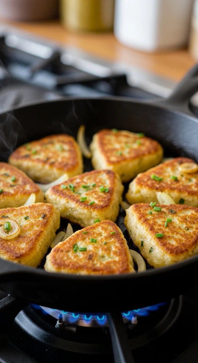 Boxty combines grated raw potato and mashed potato for texture. Pan-fry until golden and crisp. Serve with eggs or bacon.