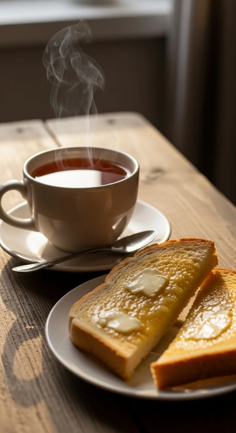 A strong cup of tea alongside buttered toast completes the meal. Simple but essential.