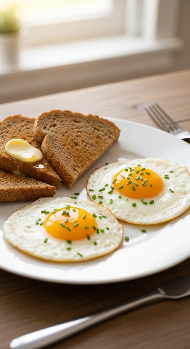 Simple and comforting. Fry eggs in a hot pan and serve with thick bread slices.