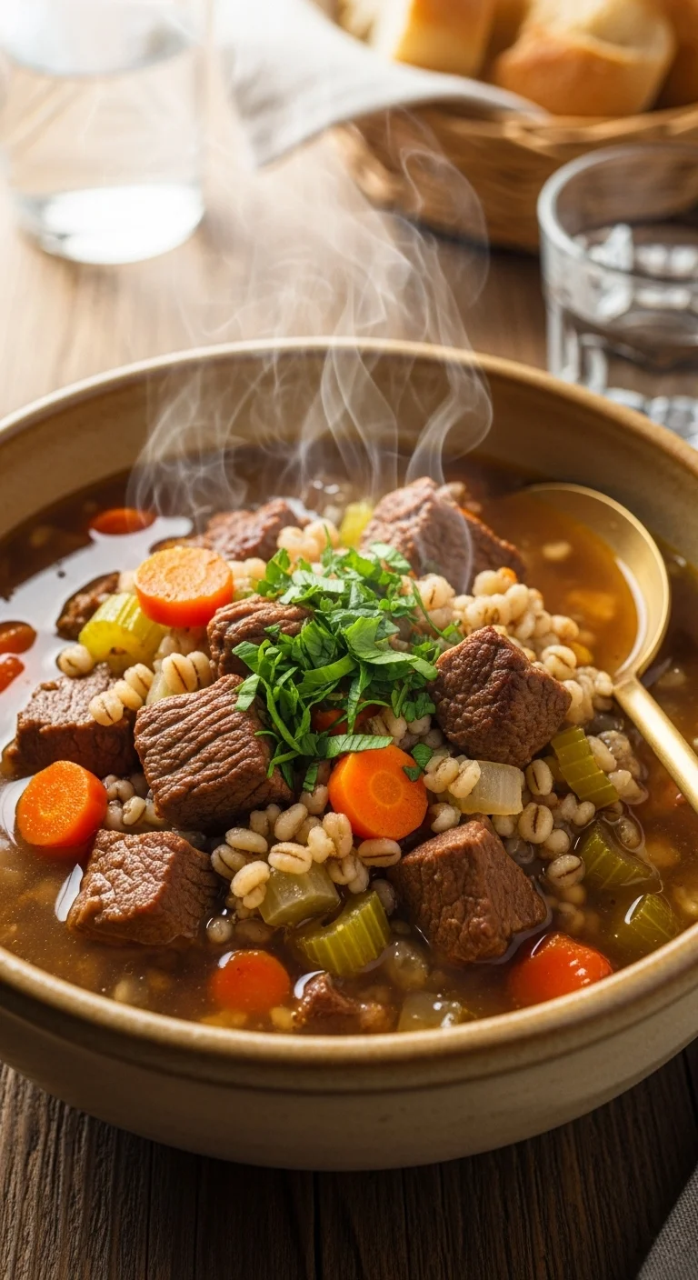 A thick soup filled with tender beef and hearty grains.