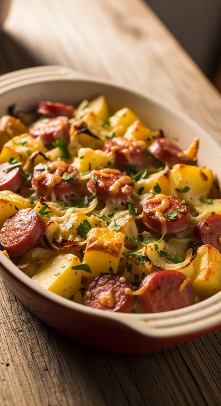 A layered dish of sausages, bacon, onions, and potatoes baked slowly together.