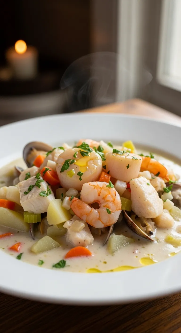 A hearty blend of fish, potatoes, and cream served warm with bread.