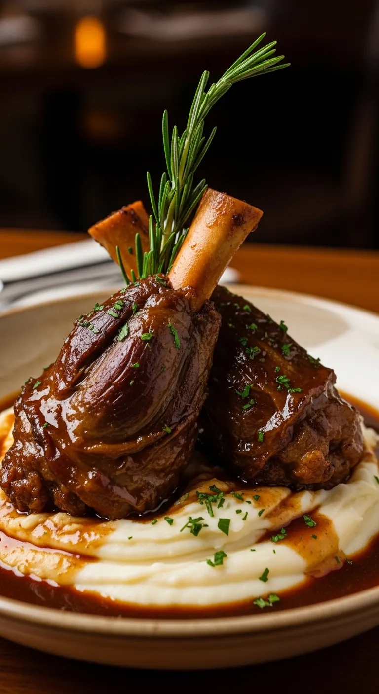 Lamb shanks braised until tender and served over mashed potatoes.