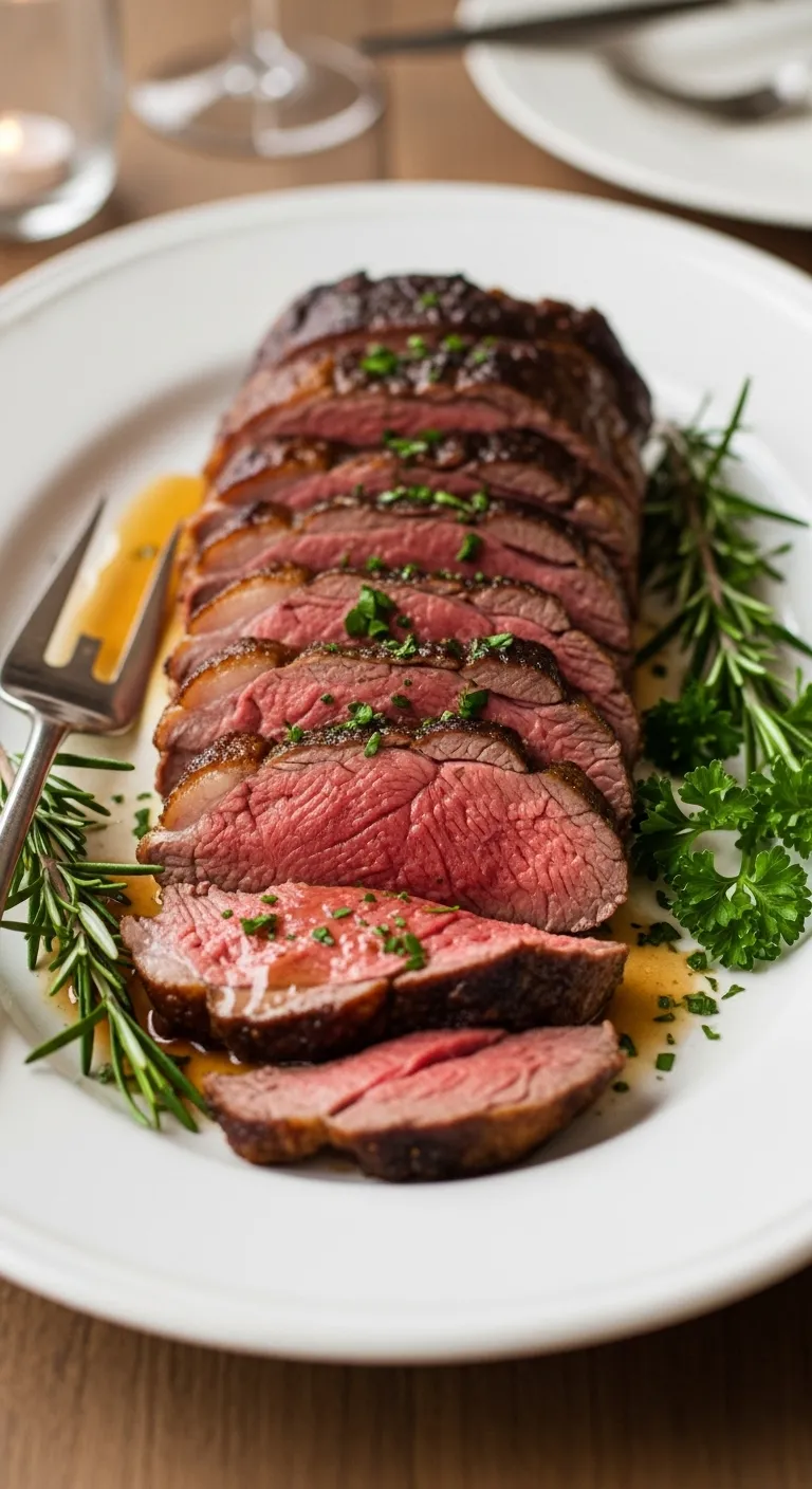 Lamb roasted with rosemary and garlic, sliced and served with pan juices.