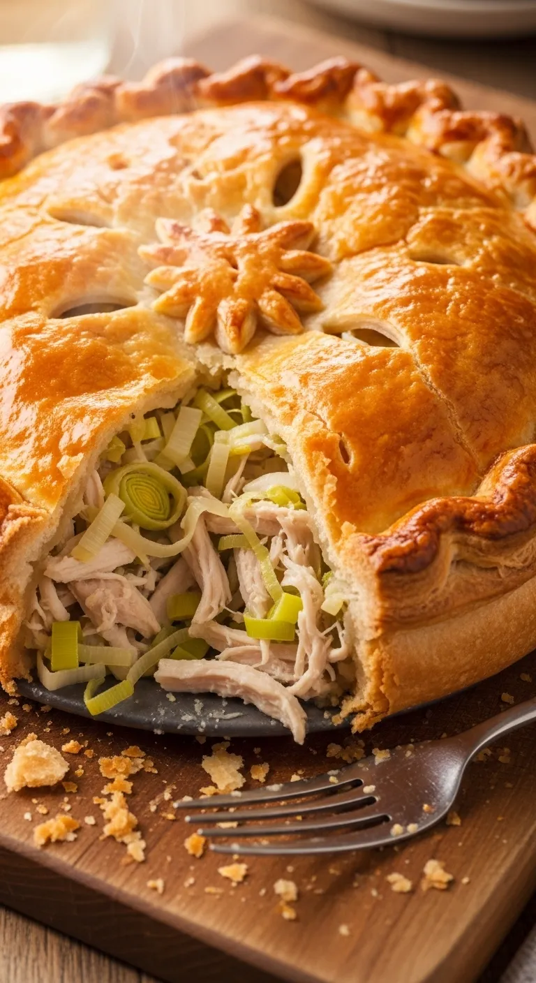 Tender chicken and leeks in a creamy filling under flaky pastry.