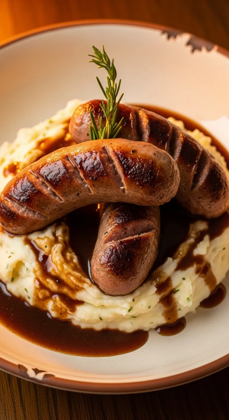 Savory sausages paired with creamy mash and rich onion gravy.