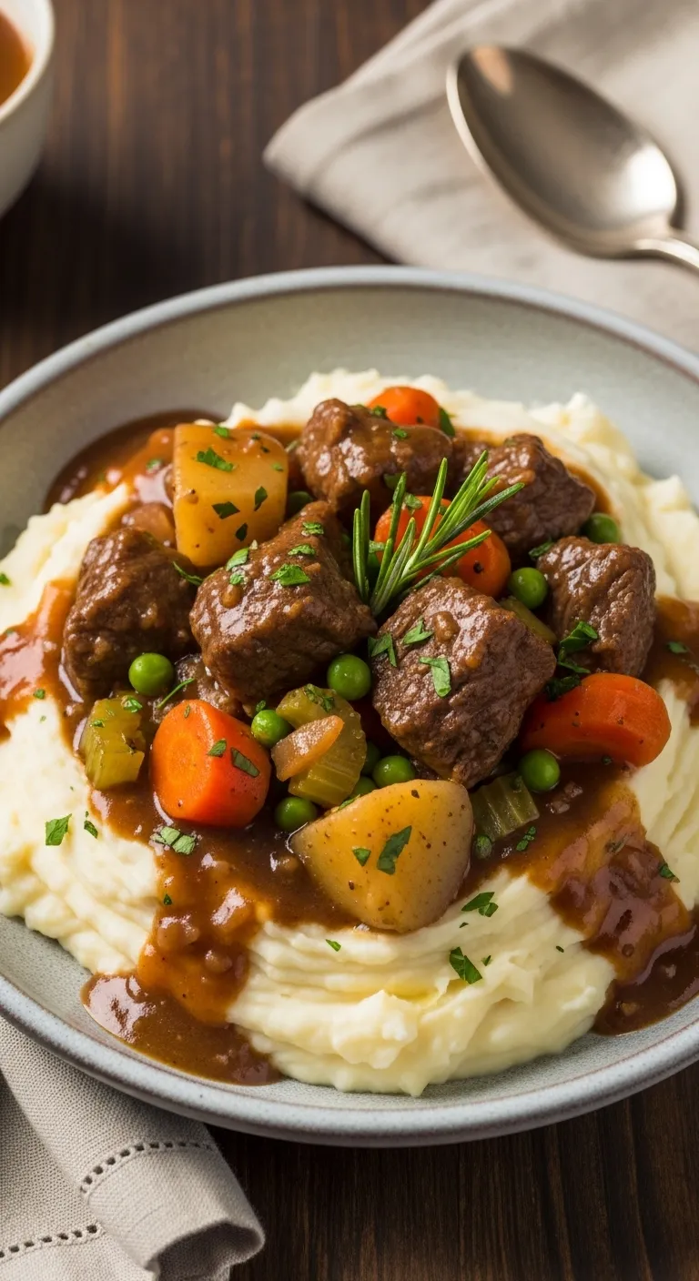 Some versions skip potatoes in the stew and serve it over mashed potatoes instead. Make the stew using any recipe, but omit the potatoes. Cook until the meat is tender and the broth is rich.