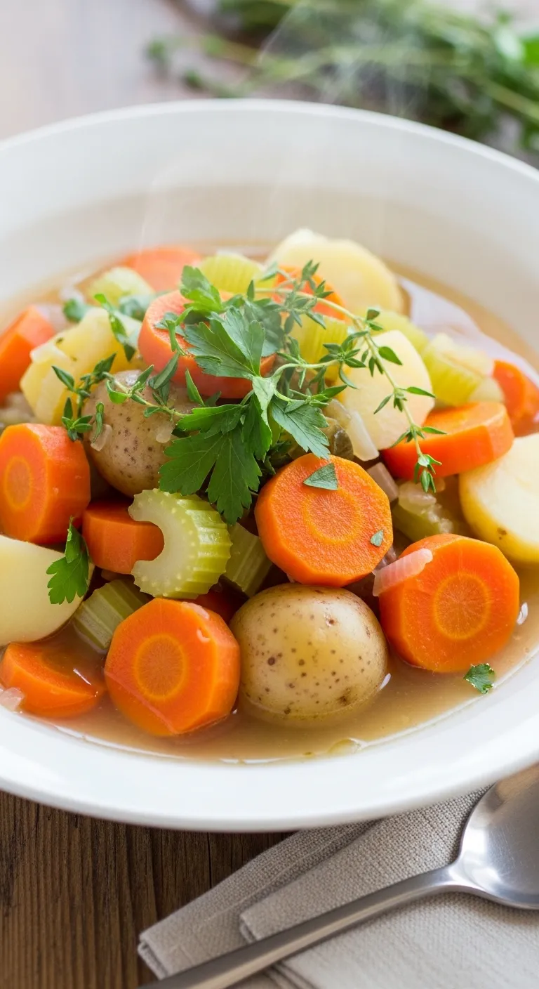 Add four quartered potatoes, four sliced carrots, and two diced onions. Cook for another 20 minutes until vegetables are tender. Remove the herb bundle and season to taste.