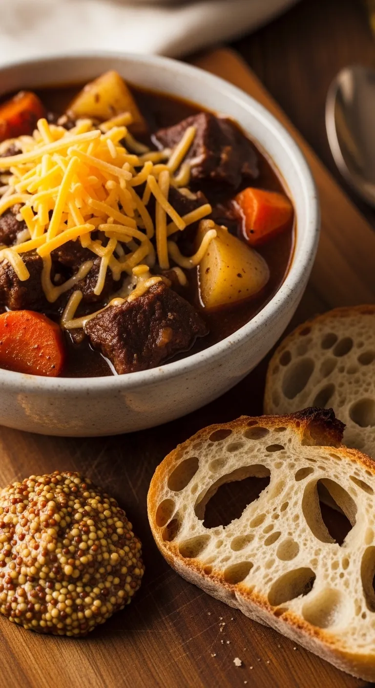Ladle the stew into bowls and top with a generous sprinkle of sharp cheddar cheese. The cheese melts slightly from the heat, adding richness and tang. Sharp white cheddar works best—the kind from Ireland or England if you can find it .