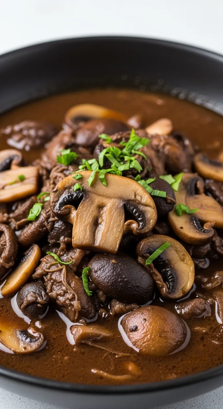 Add chunked carrots and potatoes during the last 30 minutes. The mushrooms absorb the Guinness and beef flavors while adding their own savory notes. This version is especially satisfying on cold nights.