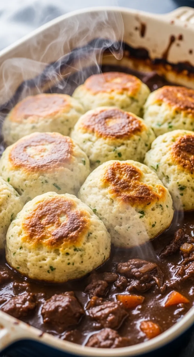 During the last 30 minutes, bring the stew to a bubble and drop the dumplings on top. Cover and cook until they’re fluffy and cooked through.