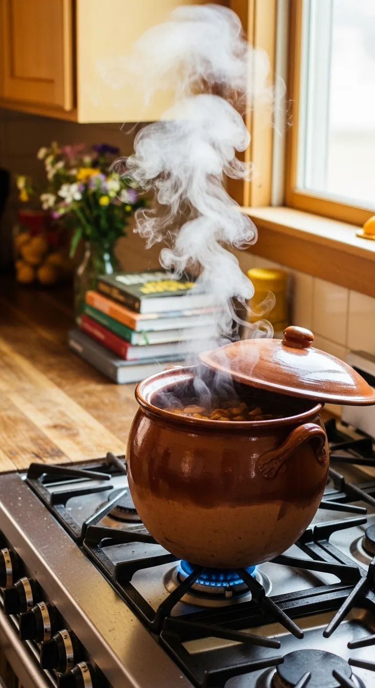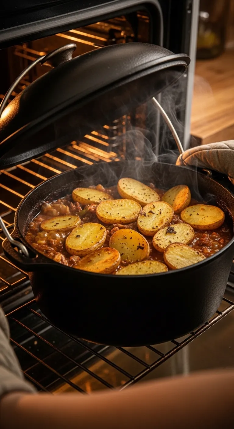 Cover and cook over very low heat for about two and a half hours. Don’t peek too often—the steam is what cooks everything. The potatoes break down and thicken the broth naturally, creating that signature velvety texture .